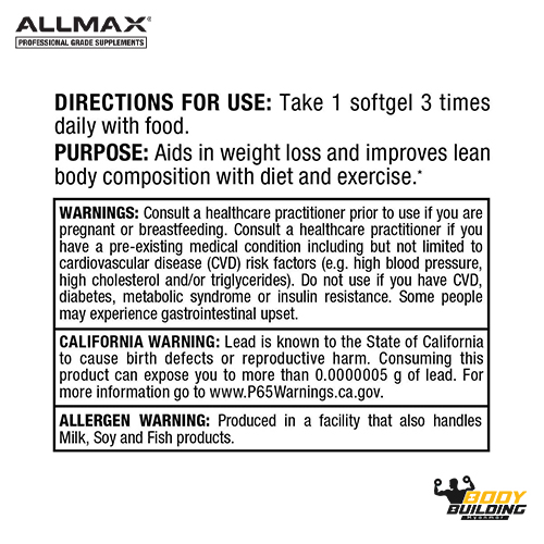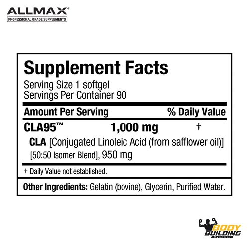 THE ALLMAX DIFFERENCE: Contains a full 95% active CLA isomers; 950 mg of pure CLA per 1000 mg softgel capsule