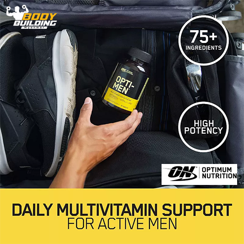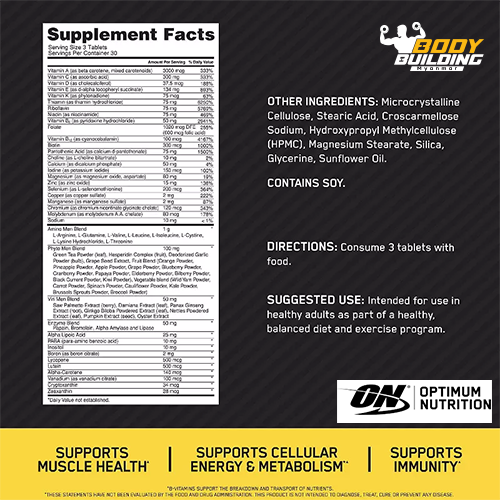 Each 3-tablet serving of Optimum Nutrition Opti-Men daily multivitamin can be taken all at one meal or spread across meals throughout the day