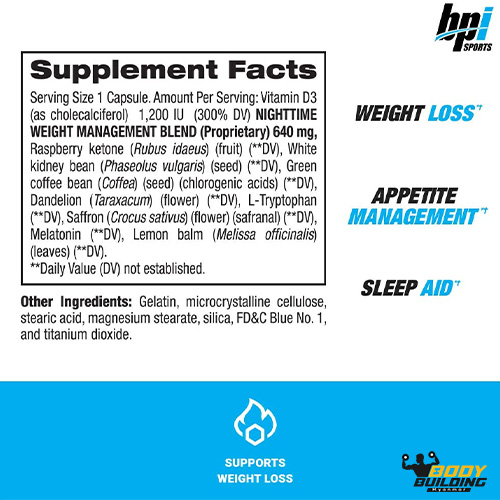 BPI Sports Nite Burn is the first fat burner that takes the night shift on weight loss. This non-stimulant fat burner formula promotes relaxation and deep, natural sleep while enhancing metabolic activity so you can burn more fat while you're asleep. Now, in addition to the efforts you put in during the day, Nite Burn can help you burn fat at night! Unlike many fat burners, it does not contain stimulants, so it's safe to take before bed. This thermogenic capsule contains high-quality melatonin, L-tryptophan, green coffee bean, white kidney bean, raspberry ketones and lemon balm to support healthy, deep REM sleep, as well as fat loss, metabolism and appetite management. Plus, you can rest easy knowing Nite Burn is non-habit forming and does not require a prescription. It contains no fillers, no artificial colors, and no artificial flavors. Key Benefits: Burn Fat: Nite Burn is an extra-strength thermogenic that works by raising your internal body temperature, which requires energy. As you burn calories, you require more energy, which forces your body to tap into excess fat stores and burn it off as energy. Boost Metabolism: Nite Burn contains key fat-burning ingredients like green coffee bean and raspberry ketones to keep your metabolism in full swing. Sleep Aide: Sleep is an important part of weight loss.With pure, high-quality melatonin and L-tryptophan, Nite Burn promotes healthy, deep REM sleep so you can wake up leaner and well rested. Non-Stimulant: This sleep aide contains non-stimulant ingredients that support weight loss without keeping you up at night. BPI Sports is a sports nutrition company offering affordable, high-quality supplements, free workouts, diets, and fitness advice.